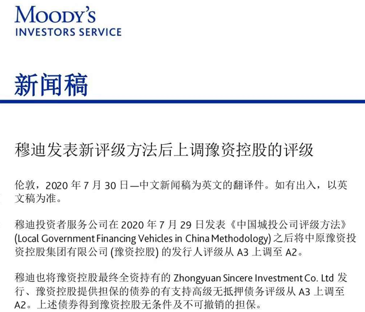 2020年7月30日,集團公司獲得國際評級機構穆迪投資者服務公司(以下簡稱“穆迪”)上調主體評級。本次上調后,集團公司的發行人信用等級從A3調整至A2,展望為穩定,成為我省首個獲得A2主體評級的企業,與河南省政府支持能力分數一致,也是全國同類省屬功能性企業獲得的最…...