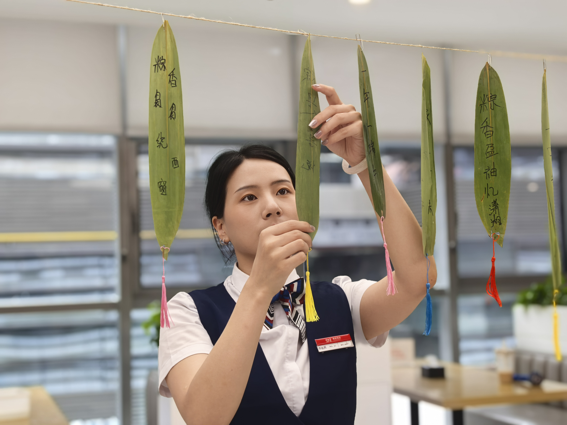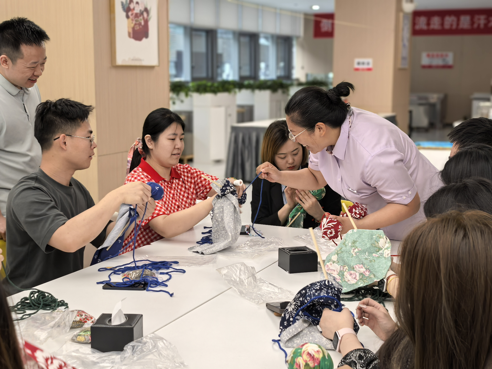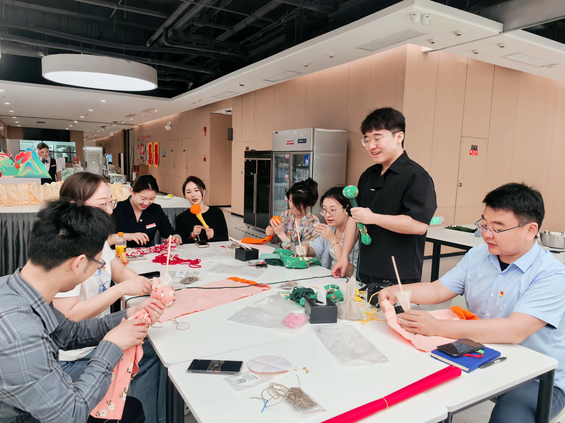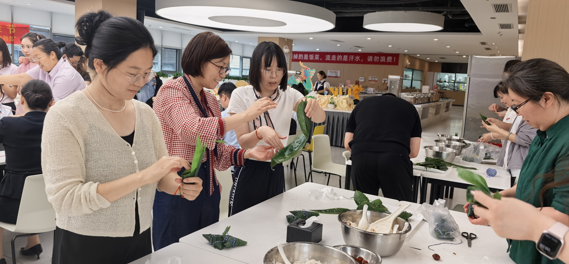 活動(dòng)現(xiàn)場(chǎng),職工們懸掛起“清廉端午”“節(jié)儉養(yǎng)德”等黨建標(biāo)語(yǔ),用寫有廉心寄語(yǔ)的粽葉裝點(diǎn)會(huì)場(chǎng)。同時(shí),選用艾草、粗布、普通糯米等簡(jiǎn)易材料,制作簡(jiǎn)素粽品、香囊、艾錘,以實(shí)際行動(dòng)踐行“節(jié)儉過節(jié)、廉潔過節(jié)”理念。手工DIY環(huán)節(jié),職工們熱情高漲,紛紛挽起衣袖加入包粽子、制作香囊和艾錘的行列。在中國(guó)銀行金融島支行員工及餐廳工作人員的指導(dǎo)下,不一會(huì)兒,四角粽、長(zhǎng)粽等各式粽品與艾草香囊、布制艾錘等傳統(tǒng)手作便制作完成?,F(xiàn)場(chǎng)布置精心、氛圍濃厚,不僅讓職工們感受到了傳統(tǒng)文化的魅力,也深刻體會(huì)到了集團(tuán)“家文化”的溫暖。